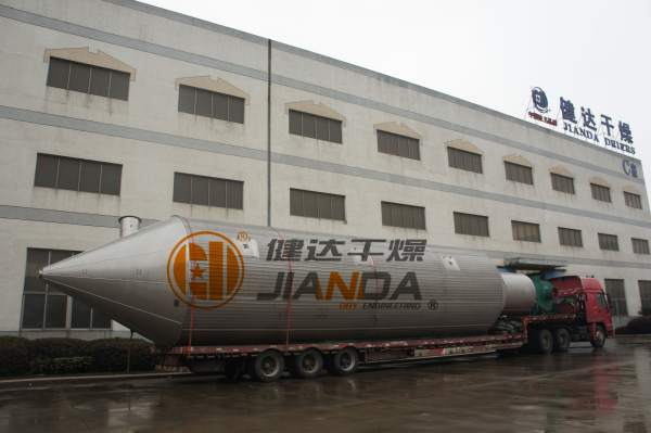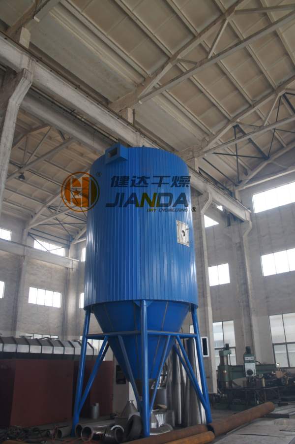 空氣通過(guò)加熱器加熱后,經(jīng)送風(fēng)機(jī)進(jìn)入干燥塔頂部的熱風(fēng)分配器,通過(guò)熱風(fēng)分配器后,熱空氣均勻的進(jìn)入干燥塔內(nèi),并呈螺旋狀運(yùn)動(dòng)。料泵同時(shí)將料液送至干燥塔頂部的離心噴霧器,料液被噴成極小的霧狀液滴。使料液和熱空氣接觸的表面積大大增加,水份迅速蒸發(fā),在極短時(shí)間內(nèi)干燥為干品。干品由旋風(fēng)分離器與濕空氣分離,經(jīng)旋風(fēng)分離器底部的集料旋蝸室由干燥的空氣送至小旋風(fēng)分離器分離,并收集在收料筒,尾氣經(jīng)引風(fēng)機(jī)排出。